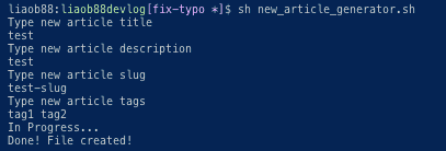 これが面倒になってきたので、対話型のスクリプトを生成して自動化したいと思いました。 特に Front matter に関していえば他の記事からコピペするというエンジニアらしくないことをしていたので。。。